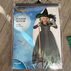 Enchanting witch costume with green and black design. Includes matching hat. Perfect for Halloween fun.