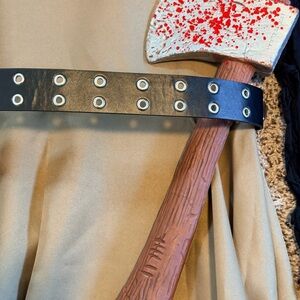 Comes with belt, tights, plastic axe, headband and 1 piece disheveled dress.