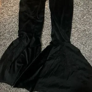 This sleek black jumpsuit features a white chest patch with the iconic red bow, an attached tail, and retro bell bottom flared legs. Size medium 8-10