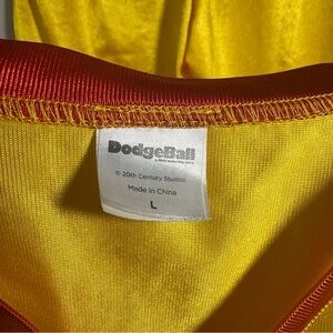 Bold yellow jersey featuring striking red script. Ideal for everyday style. This product is a Dodgeball uniform costume in size Large, featuring a yellow jersey shirt and shorts. The shirt has short sleeves and is made of lightweight polyester jersey material, suitable for cosplay or Halloween costumes. It is machine washable and was sourced from China. The complete uniform from the brand Spirit is perfect for adult men looking to dress up as an average Joe for themed events or plays.