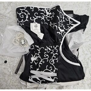 The Spirit Halloween Girls Black White Midnight Vampiress Dress with a Choker in size XL 12-14 is a stylish and themed costume perfect for Halloween. Made of polyester material, this dress features a black and white color scheme with a chic dress and comes with choker accessorie. It is designed with elastic and stretch properties for a comfortable fit, making it ideal for young girls looking to dress up in a spooky yet fashionable outfit for Halloween festivities! This costume is new! Comes from a smoke and pet free home!