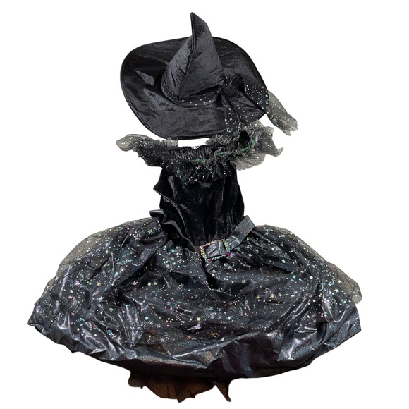 Conjure up some enchantment with this bewitching girls' costume! The dress boasts a shimmering velvet bodice that cascades into a full, star-dusted skirt, ready to twirl through the night. Glittering ruffled sleeves and a matching belt add delightful accents. To complete the look, a classic pointed witch hat with flowing tulle is included. This ensemble is perfect for trick-or-treating, Halloween parties, or imaginative play.