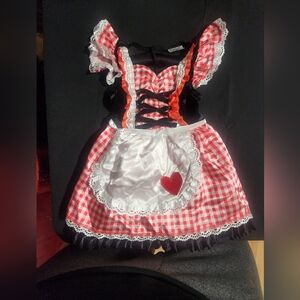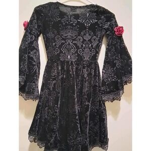 Keywords: Halloween costume, Gothic Devil costume, Spirit Halloween, velvet dress, wings, headband, child costume, small size, black dress, red ribbon, lace trim, cosplay, theatrical costume, gothic fashion, devil costume