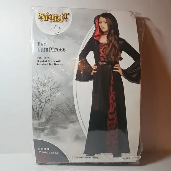 Spirit Halloween Kids Bat Vampiress Costume Girls L Goth Maxi Hooded Cape Brooch