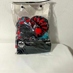 Fun carnival costume set with dress, hat. Features bold red, black, and blue colors. Includes basket.
