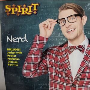Spirit Halloween Med Nerd Costume Plaid Jacket Pocket Protector Bow Tie Glasses