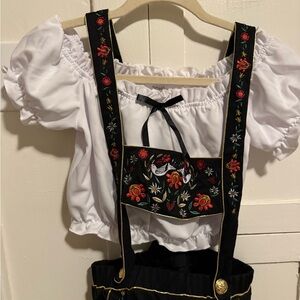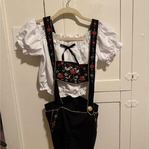 Festive Oktoberfest Maiden outfit. Includes shirt, suspenders with shorts, and thigh highs socks.