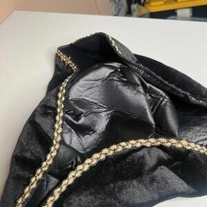 Includes pirate-style dress with lace and gold trim, matching tricorn hat, belt with gold chain accent, and Halloween trick-or-treat bag.