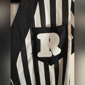 Referee costume set includes dress, hat, and shorts. Black and white striped design with red accents. This does not include rhe whistle or thigh high socks. I bought the costume on Poshmark and it didn't include them then either. Price reflects this. Please note the missing pieces.