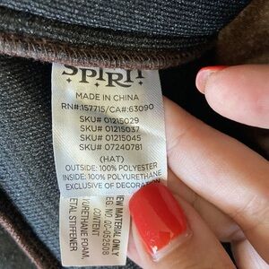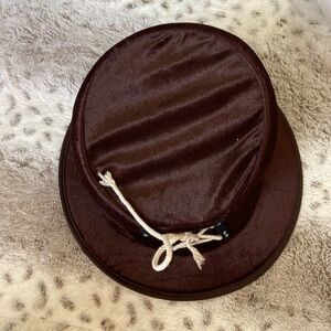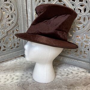 This Spirit Halloween steampunk hat is brown velvet with ropes laced up the front. Wear it as part of a costume or to a Halloween party. It is gently worn and is in excellent condition!