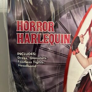 The Spirit Horror Harlequin Costume for children in size Medium (8-10) includes a red dress, one glove, and is footless. This Halloween-themed outfit is a complete ensemble perfect for young girls looking to dress up in a spooky and stylish costume. The brand, Spirit, ensures quality and authenticity in this fun and festive attire.