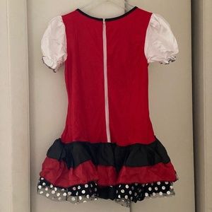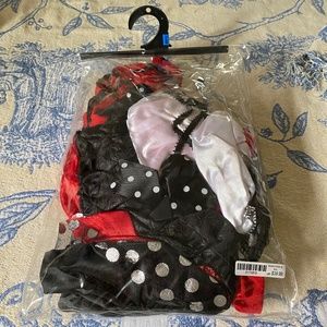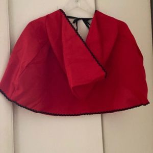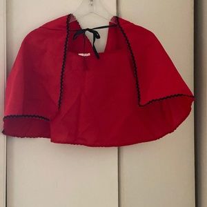In EUC, here is the Sweet Red Riding Hood costume by Spirit. Worn to trick-or-treat just once 8 or so years ago. It is still in its original bag, but missing the informational insert. The plastic coat-hanger bag, however, does still have the price sticker, size, and SKU number, which confirms that it is Spirit's Sweet Red Riding Hood costume. Includes red ruffled dress & hooded capelet, as shown. No flaws at all, except that the material & care tags were removed. From other listings of the same costume, they are: Care: Hand wash cold water/line dry. Material: Polyester & spandex.