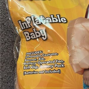 Fun inflatable baby outfit. Includes bonnet and bib. Battery-operated fan for easy inflation.