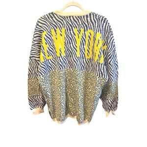 Bold and rare Spirit Jersey “New York” knit sweater featuring a mixed zebra and leopard pattern in blue, cream, and neon yellow. Back features large NEW YORK lettering in a vibrant yellow knit. Made from 100% cotton with a soft, comfy medium-weight feel.