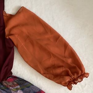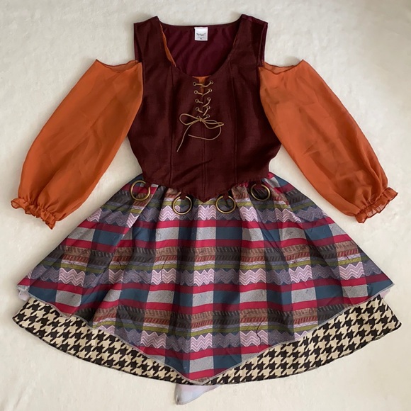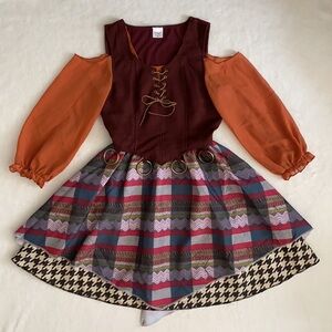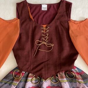 Charming kids costume by Spirit. Features orange sleeves and burgundy bodice. Striped skirt with a mix of colors. Perfect for Halloween fun.