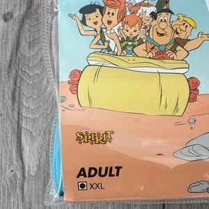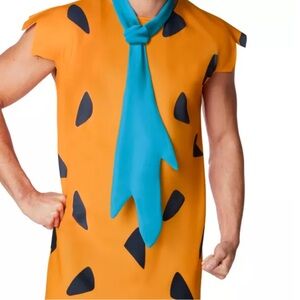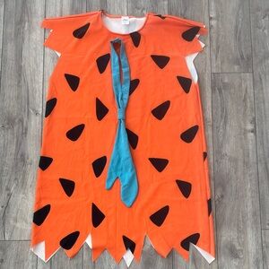 Vibrant Stone Age attire for men. Features orange tunic with blue tie. Ideal for Halloween festivities.