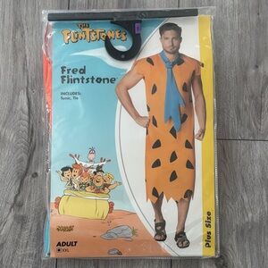 Vibrant Stone Age attire for men. Features orange tunic with blue tie. Ideal for Halloween festivities.