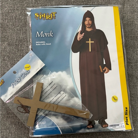 Embrace the monk look with this Spirit costume. Dark brown robe with hood. Includes cross accessory.