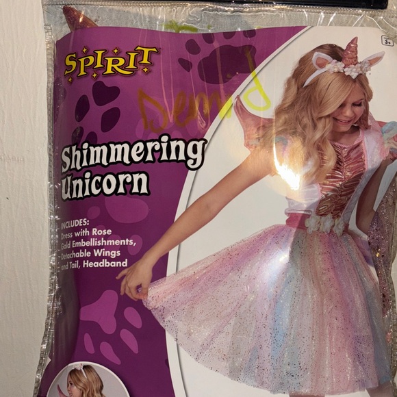 Vibrant unicorn outfit with sparkling accents. Features a multicolor dress, detachable wings, and a unicorn headband. Ideal for enchanting events.