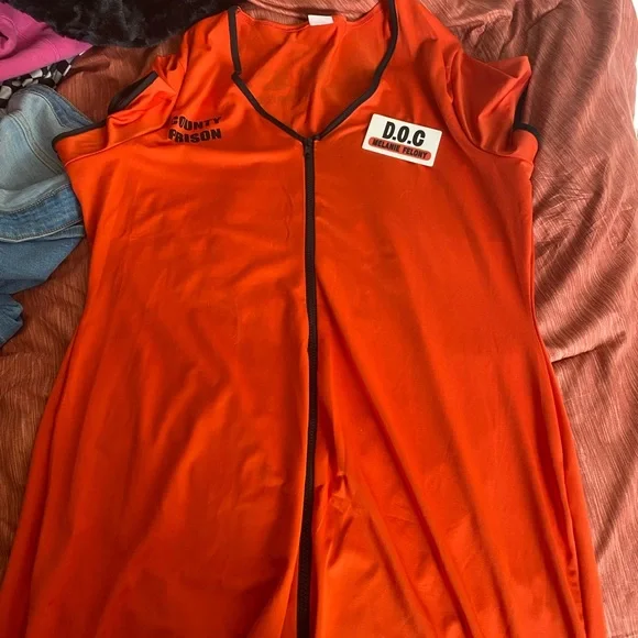 Orange prison-themed dress. Black trim details. Fun and bold design. Worn one night on Halloween, perfect condition! Size 1x but I’m a 2x and it fit me perfectly!