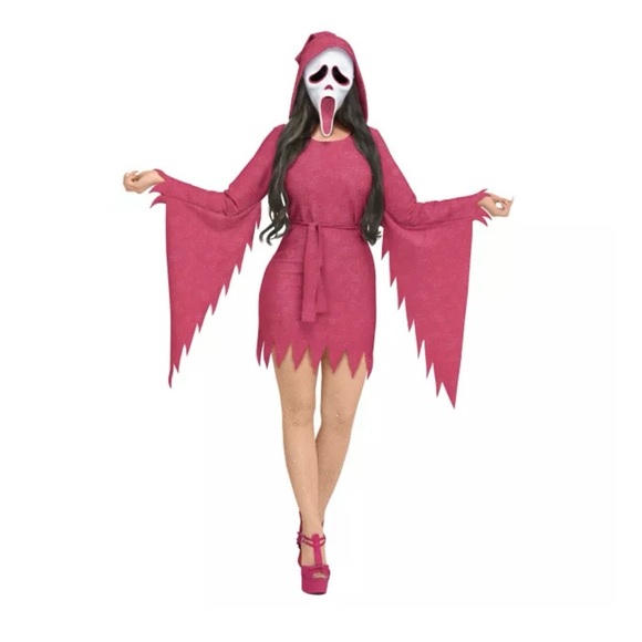 Chic pink ghost dress with hood. Perfect for Halloween fun. Stand out in style.