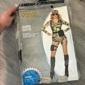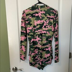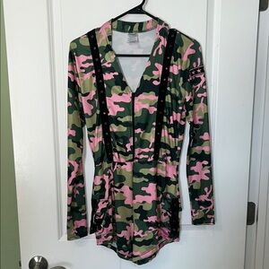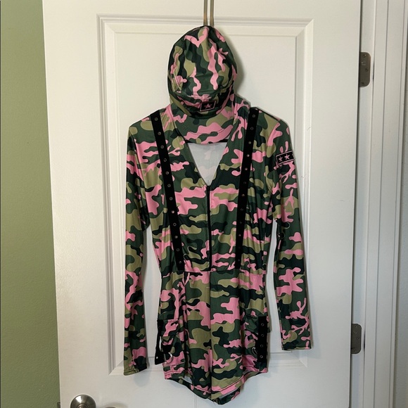 Eye-catching utility costume with a pink and green camo design. Features long sleeves. Ideal for a bold fashion statement. Some minor scuffs and pilling from washing. Size medium. Originally $60. Worn once! Tights are not part of the costume just an add on.