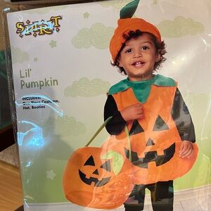 Charming kitty costume with hood and tail. Features black and white design. Ideal for Halloween.