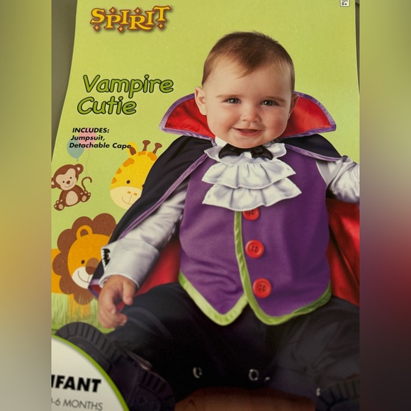 Adorable vampire costume for infants. Includes jumpsuit and detachable cape. Features purple vest with red lining and black pants.