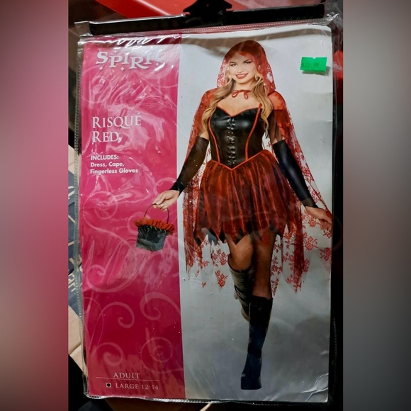 Bold red costume with black accents. Includes dress, cape, and fingerless gloves. Perfect for a striking look.