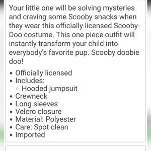 Adorable Scooby-Doo costume. Features brown jumpsuit with blue collar. Includes hood with ears and tail. Perfect for Halloween fun.