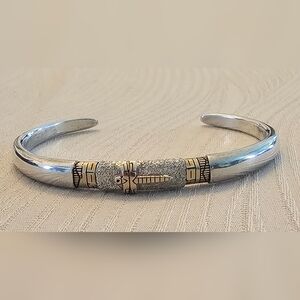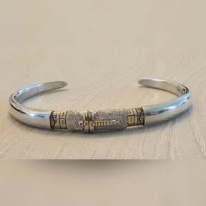 SUMMER SPIRIT = .925 Sterling Silver & 14K Gold Dragonfly Cuff Bracelet. The dragonfly and 2 wrap around inlays are 14k yellow gold. This bracelet weighs 24.3 grams. The inside circumference is approx. 6-3/4" including the gap. The gap distance is 1-1/4". The top of the bracelet measures 7.3mm wide from north to south