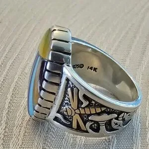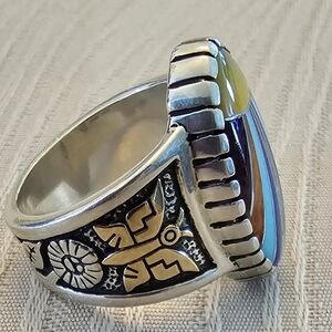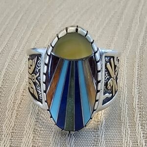 SPRING SPIRIT = Sterling Silver 925 & 14k Gold Scarab 6.25 Ring has a center egg-shaped inlaid purple spiny oyster, orange spiny oyster, Sleeping Beauty turquoise, lapis, yellow shell and Royston turquoise stone. Running down both sides of the ring are wonderful hand carved silver and gold patterns that include bugs and plants.