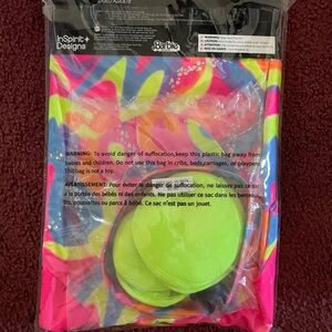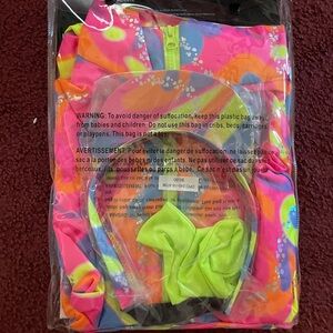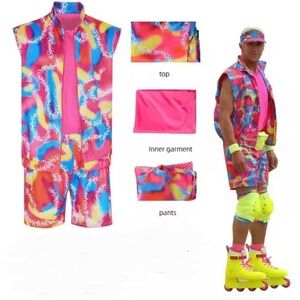 Vibrant Barbie and Ken costume with a pink leotard and multicolor patterns. Includes elbow and knee pads. Ideal for themed parties.