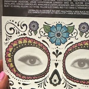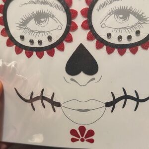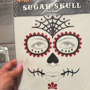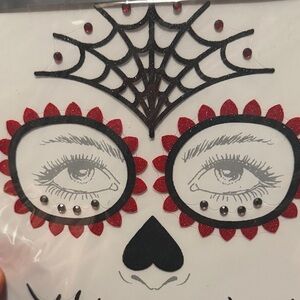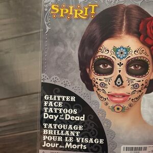 Create a vibrant sugar skull look with Spirit's glitter face tattoos. Features bold black, red, and blue designs. Easy to apply and remove.
