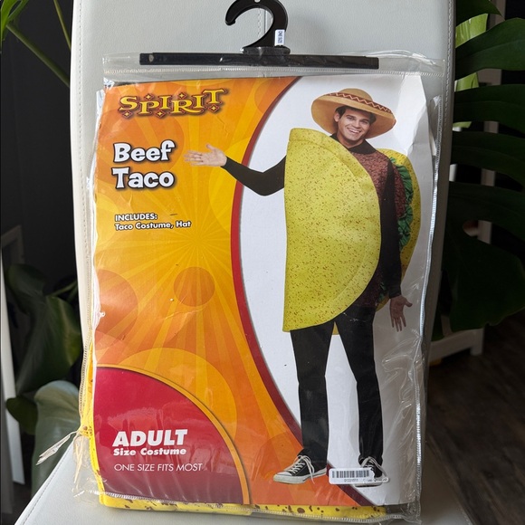 Vibrant taco costume with a yellow shell. Includes matching hat. Ideal for festive occasions.