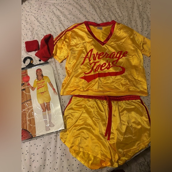 Vibrant yellow and red costume set. Includes top and shorts with 'Average Joe's' print. Perfect for themed events.