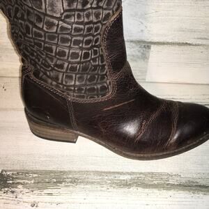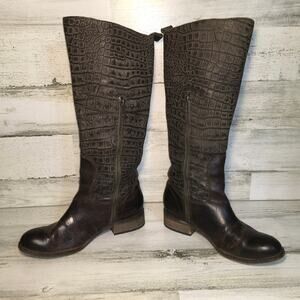 Spirit by Lucchese Bailey Riding Boot in color Chocolate (dark brown). Womens size 6 M. Leather upper with embossed croc detail. Inside zipper closure. 1.25" Heel. 0.25" platform. 14" Shaft. 14" circumference at top. Condition as seen in pictures.