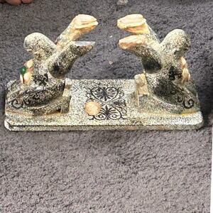 Comes in the pieces as pictured. No signatures or writing that I could find. It’s around a foot tall when you put it together. The shells will come off! I will include all that I have in the order, in case the new owner wants to glue them back on.