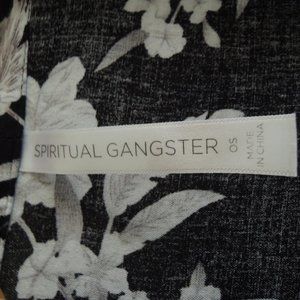 Spiritual Gangster black & white floral Maya Kimono, One Size. Airy, versatile rayon robe has wide 3/4 length sleeves, 2 patch pockets, and attached front ties. Black with floral print in taupe and ivory. Elevate your tee & shorts combo with this flowy, vibrant top - wear as beach cover, at the pool, over tank and jeans, etc. EUC.