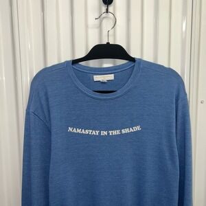 Cozy blue sweatshirt with 'Namastay in the Shade' print. Perfect for casual wear.