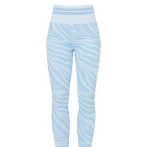 Stylish zebra print leggings. Features a blue and white pattern. Comfortable and stretchy fit.