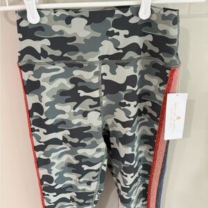 Really fun grey camouflage patterned leggings with red/pink/black/blue metallic glitter stripes down the side of the leg. Smooth and soft material! High waisted 7/8 length style.