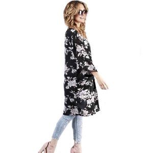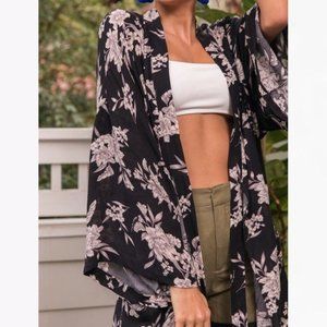Black and white floral patterns kimono robe in 100% rayon. Patch pockets. Built in belt. Wear tied or open. Could be a beach cover up, duster, or just lounge wear. One size. Excellent pre-owned condition. No flaws.