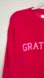 Dark pink cropped sweatshirt pullover has "Grateful" spellout across chest in light pink felt. Top is a French terry fabric, has crew neck, long sleeves with ribbed cuffs, and raw rolled hemline.