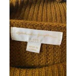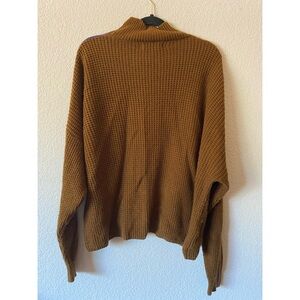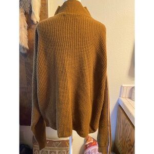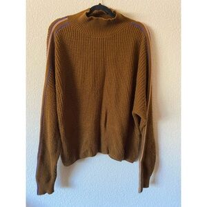 Stay cozy and stylish with this brown turtleneck sweater. Perfect for layering in cooler weather. Spiritual Gangster mustard color sweater with indigo stripes on sleeves.