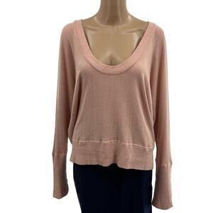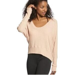 Meet the perfect post yoga tee. The Rib Long Sleeve Scoop Tee features batwing sleeves and a deep scoop neck that can be worn as a plunge or off the shoulder. Relaxed, slouchy fit. Pulls on. Made with love in Los Angeles from a soft sweater like luxe rib. Modal, polyester, spandex. Hand wash. In preowned condition.