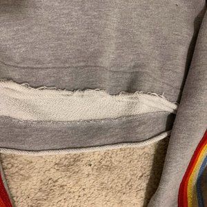 "We Are One" written across back of sweatshirt, rainbow sleeves, raw hem