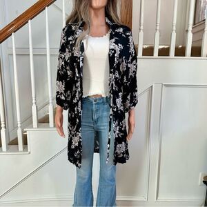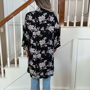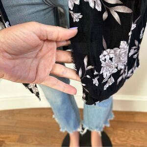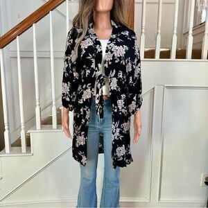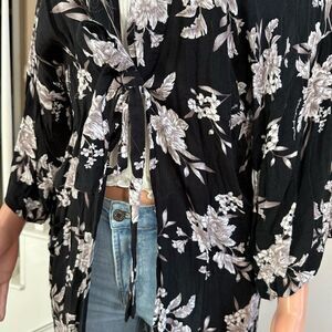 Black floral tie front kimono coverup top. Great with jeans, over a dress or swimsuit! Small defect as shown- nothing major. Size is One Size but best fits a S/M so marking as such.