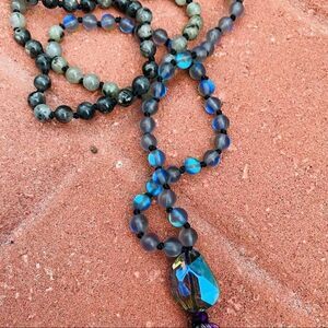 Mermaid glass beads glow in daylight. They reflects light and look like modern magic. Gemstones include Labradorite and black Labradorite -quarts crystal guru bead and silk tassel to complete this Beautiful Prayer Bead Necklace