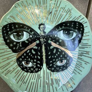 The Spitfire Girl Madame Butterfly Trinket Box is a charming medium-sized ceramic box adorned with a beautiful butterfly pattern in mint green. Perfect for all occasions, this eclectic box is a part of the Keepsake Boxes collection by Spitfire Girl. The glazed finish adds a touch of elegance to this original piece, making it a delightful addition to any adult's collection of decorative trinket boxes.